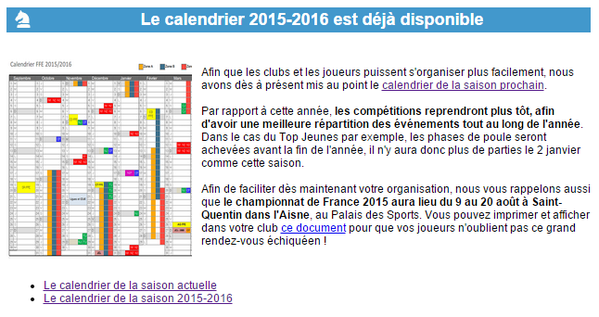 Le calendrier FFE 2016 / 2016 est déjà prêt !