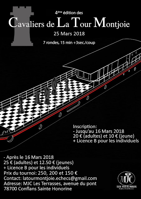 Dimanche 25 mars a lieu le traditionnel tournoi du club de Conflans. 7 rondes en 15 minutes +3 sec/coup. Inscrivez-vous avant le 16 mars sur : https://sites.google.com/site/latourmontjoie/2018