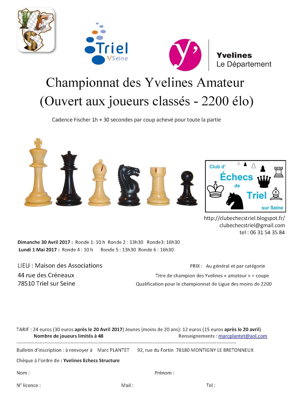 A Triel, le dimanche 30 avril et le lundi 1er mai s’est déroulé le championnat d’Yvelines amateur (< 2 200 ELO). 6 parties en 2 X 1h+ 30″ »/coup ont été disputé par chaque joueur. Et c’est CLAIRE qui remporte le titre de champion des Yvelines Amateur. Bravo CLAIRE. Bravo aussi aux 6 autres membres du club de Triel (ROMAIN, YVES, STEF, HERVE, FABIENNE et JUSTIN) qui ont participé. Merci à Manuela MARIE, adjointe à la vie associative, qui est venue assister à la fin du tournoi.