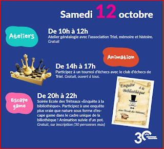 Samedi 12 octobre de 14h00 à 17h00 nous organisons un tournoi à la Bibliothèque nous avons fêté les 30 ans de la bibliothèque.C’est Jérome LEFRANC qui emporte le tournoi adulte et Julien SEVERE le tournoi enfant.Le tournoi était doté, cadeaux de la bibliothèque d’une encyclopédie jeunese et d’un superbe livre avec en couverture le château de Louis II de Bavière. Les températures clémentes étaient de la partie. Merci aux photographes ELISE et ADRIANO. Merci à VALERIE, CYBILLE et LUCILLE pour leur accueil. The last but nos the least : 2 nouvelles recrues, ANTOINE et JEROME qui fait un retour parmi nous.