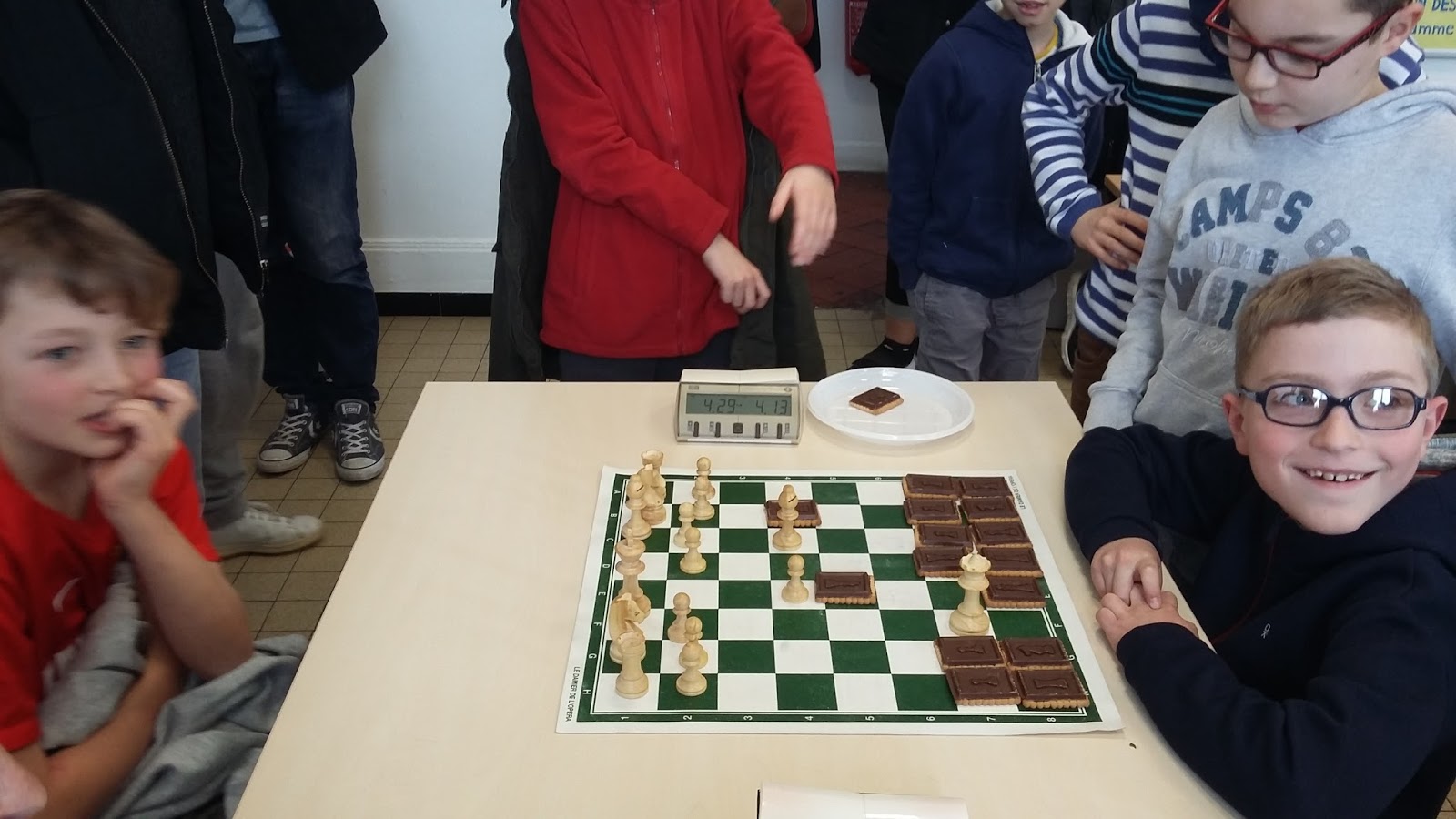 Notre matinée échecs à la bibliothèque du samedi 10 février a été annulée en raison d’un aéroport de Roissy récalcitrant au froid. Il nous fallait au moins un tournoi pour nous en remettre. Samedi 17 février c’était le premier week-end des vacances, et vous avez été 22 à venir ! Adultes, enfants et parents. 3 finales par catégorie avec comme vainqueurs YVES, EDGAR et THOMAS (à moins que ce ne soit l’inverse) et finalistes GAUTHIER JULIEN et CHARLES (à moins que ce ne soit l’inverse). On parle souvent de « manger » les pièces adverses, expression au ses figuré. Nous avons repris l’expression mais au sens propre. Avec interdiction de manger la dame en chocolat, au cas où elle aurait resservi.