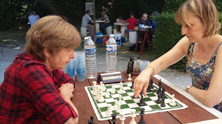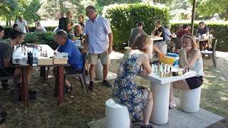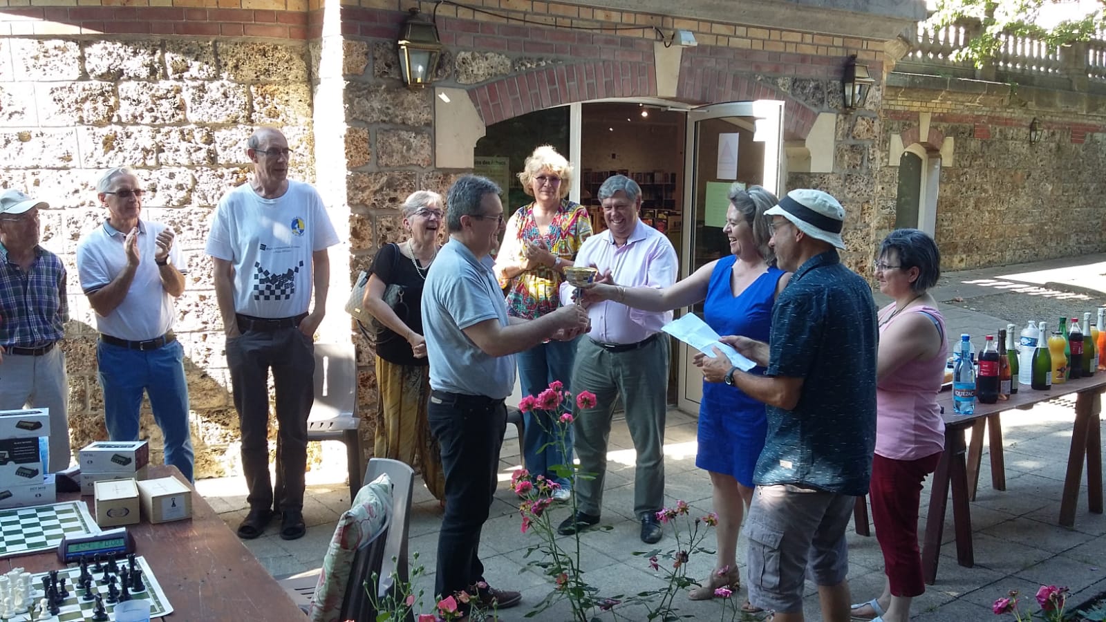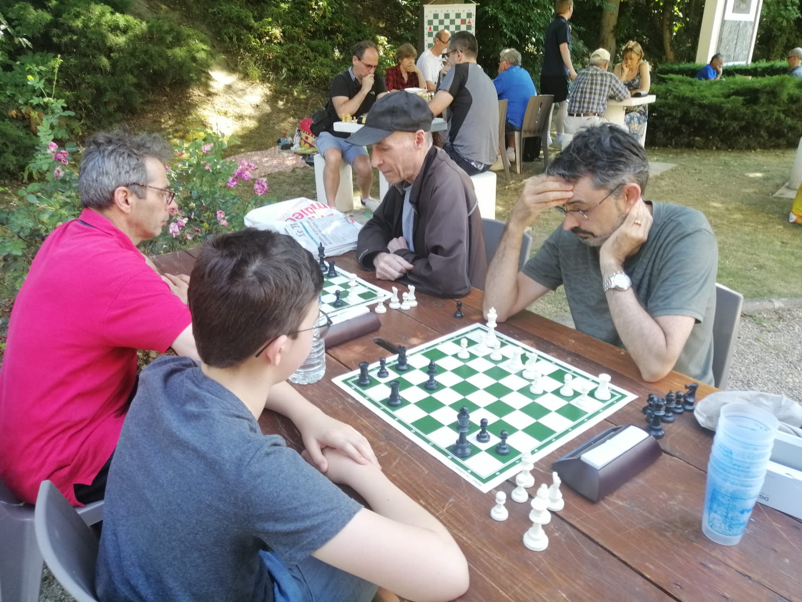 Samedi 6 juillet en collaboration avec la bibliothèque nous avons organisé notre tournoi de fin de saison dans le parc SENET. Des tables étaient à disposition le matin (à partir de10h) pour l’entrainement, pique nique le midi et tournoi l’après midi (14h-17h). Dès 14h00, 24 joueurs et joueuses se sont affrontés durant 5 parties 2 X 15 minutes KO. Aucun cas de liophilisation par manque d’eau à déplorer. Le joueur d’échecs ne pense pas uniquement à ses parties, il n’oublie pas de boire. Philippe GLOD de Verneuil s’impose avec 5/5 devant Philippe GODEFROY du club de Villennes, Philippe ETIENNE du club de Triel, JeanPierre JOLY de Villennes et Thomas GUILLEN de Triel avec 4/5 chacun. LUCE s’adjuge le titre féminin.