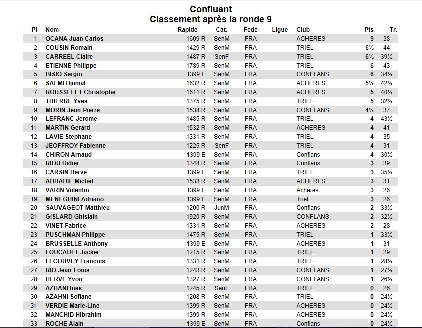 Vendredi 3 mars avait lieu à TRIEL la 3ème ronde du tournoi du Confluent. Derrière Juan Carlos d’ACHERES qui domine le classement avec 9 points, 3 triellois occupent les places suivantes : CLAIRE et ROMAIN avec 6,5 points puis PHILIPPE avec 6 points. YVES n’est pas loin avec 5 points. JEROME, FABIENNE et STEPHANE font mieux que se défendre avec 4 points. Hier ADRIANO fait une entrée fracassante avec 3 victoires.